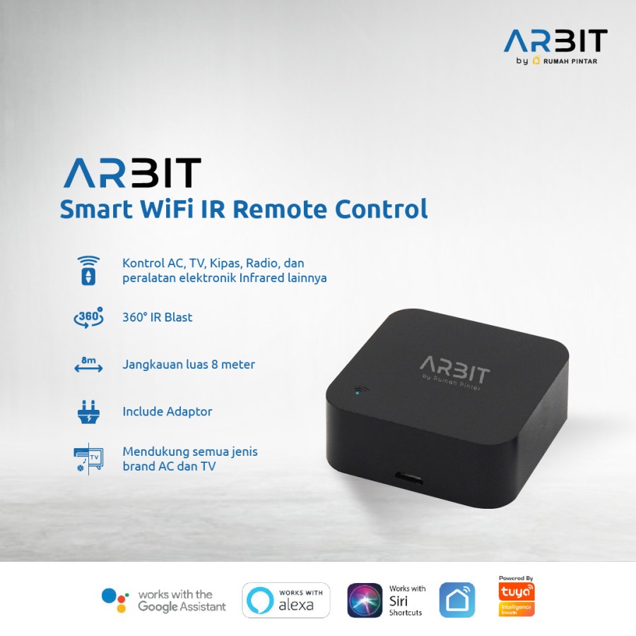 merupakan perangkat smart home dari ARBIT yang dapat digunakan untuk mengontrol alat-alat yang menggunakan remote infrared dan menggantikan remote infrared konvensional. ARBIT Smart WiFi Infrared Remote dapat digunakan untuk TV, AC, Speaker, DVD, Setup Box, dan alat lainnya yang menggunakan remote infrared.
